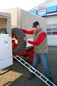 Mit dem Willen zum Erfolg macht sich die Mannschaft ans Werk. Nach der Pritsche ist das Führerhaus an der Reihe. Alles wird zerlegt, gesandstrahlt und verschweißt. Der Materialverbrauch: sechs Quadratmeter (!) Blech, meterweise Winkeleisen und mehrere Pakete Schauben. Und Spatelmasse? Natürlich keine! Im nun blanken Blech waren alle Sünden zu sehen, die ausgebeult werden mussten. Neubauer: "Das ging hier so laut zu wie früher im Mannesmann-Röhrenwerk." Nach getaner Dengelei war's Zeit fürs Grundieren, Füllern und Lackieren – in den Farben rot und weiß. Neubauer: "So wollte der Sammler den Wagen haben, auch wenn das Prachtstück so im Original nie ausgesehen hatte. Aber rot-weiß war bei Lastern in den 50er Jahren durchaus 'in'." Und damit alles schön nostalgisch wirkt, erhielt der Borgward ein Stoffdach und eine Plane aus Gewebe in Jute-Optik.